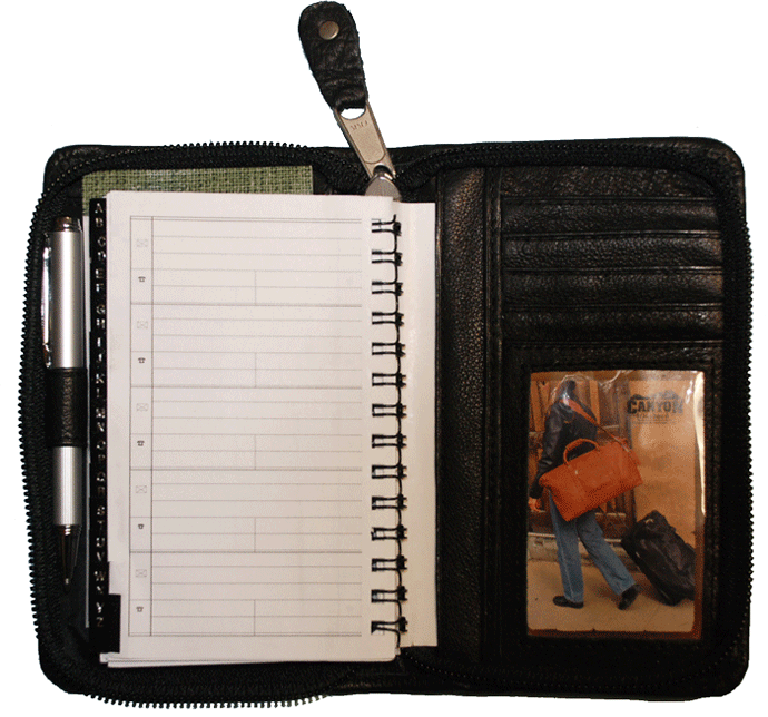 Our 5 1/8" x 3 7/8" x 1/2" small pocket planner has a weekly/monthly calendar insert, 40-sheet 3" x 4" blank notepad and gunmetal mini pen included. ID holder, 3 card slots and 2 document pockets inside front cover, and a pocket on back cover.